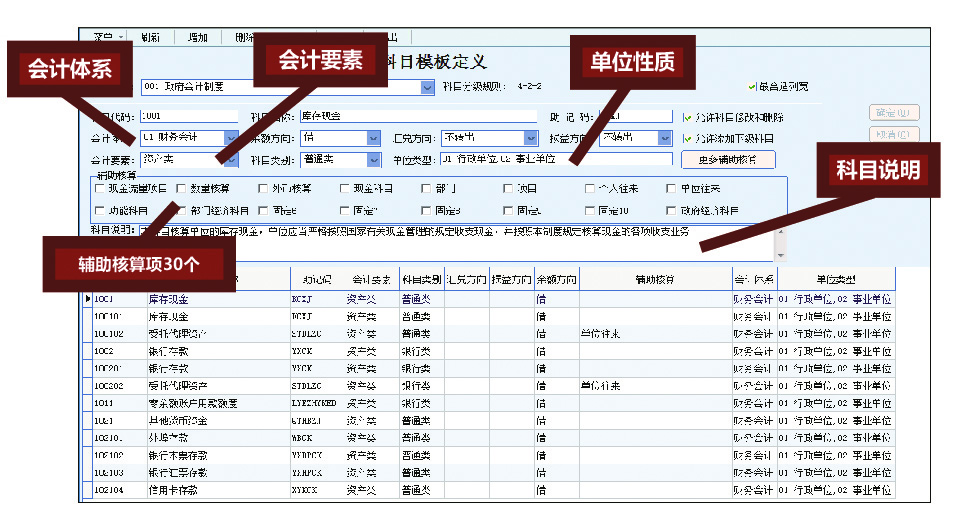 預(yù)置會(huì)計(jì)科目:區(qū)分適用單位惟質(zhì)(行政單位、事業(yè)單位),提供30個(gè)輔助核算項(xiàng)及科目使用說明