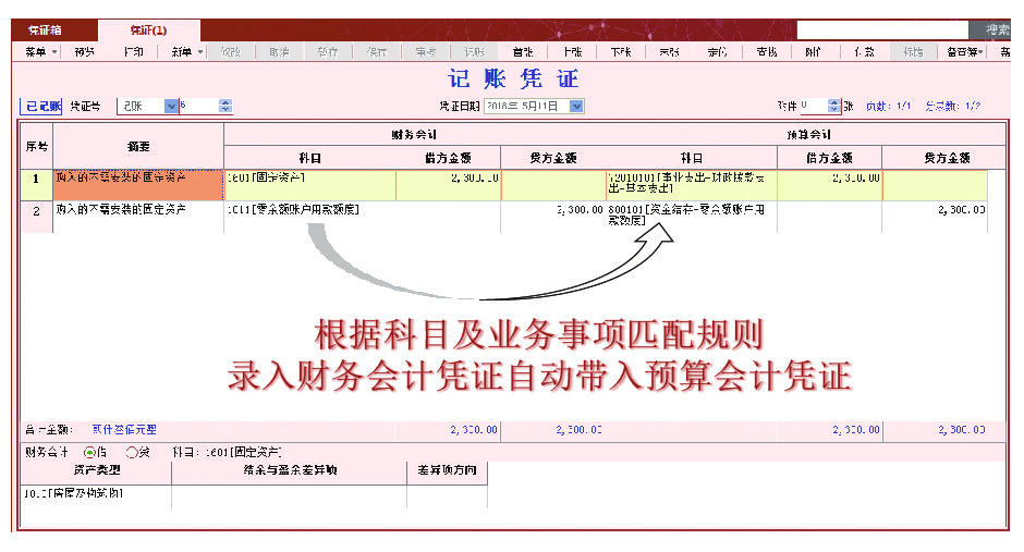根據(jù)科目及業(yè)務(wù)事項(xiàng)匹配規(guī)則,錄入財(cái)務(wù)會(huì)計(jì)憑證自動(dòng)帶入預(yù)算會(huì)計(jì)憑證。